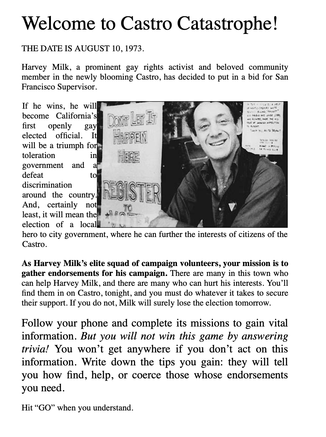 While I was working at The Go Game I wrote a historical narrative game — a cross between participatory theater, role-playing, and an adventure game — inspired by the history of Harvey Milk, the first openly gay man elected to public office in California. I ran the three-hour game twice, with about 25 players each time. Players played as supporters, and walked around the game zone centered on Castro Street, earning the endorsements of several actors playing the roles of Harvey’s friends and competitors. Local bookstores, drugstores, and the Castro Theater were all in on the game and helped provide clues.