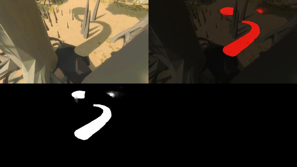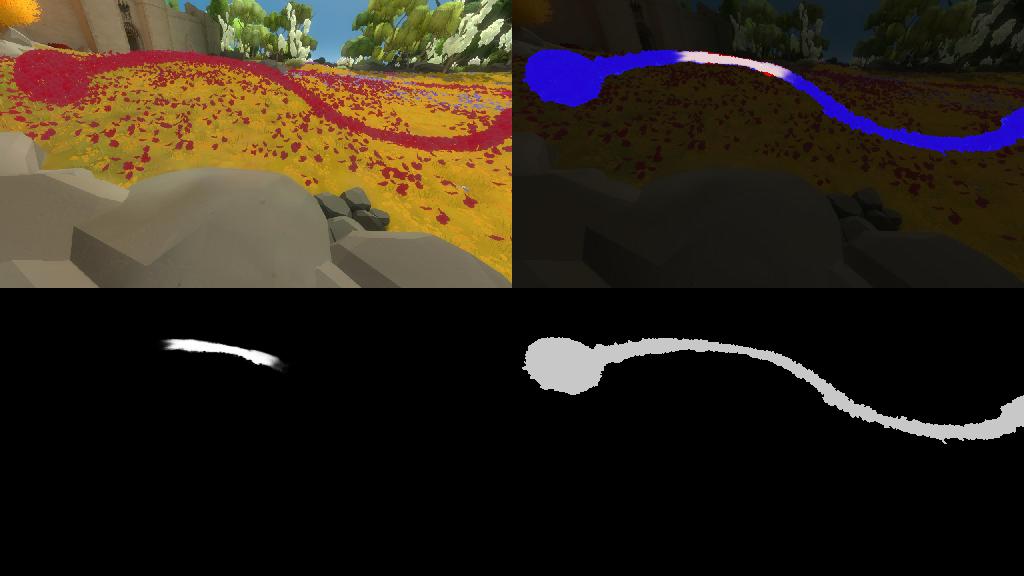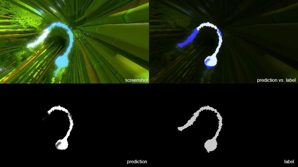 After saving the best performing model, I used the predict.py script to identify examples where the training data was incorrectly labeled or ambiguous, or where the game itself made for a particularly challenging example. In each of these examples, the top left is the screenshot, bottom left is prediction, bottom right is my hand-created label, and the top right is a composite of the label and prediction. In the composite, white indicates true positive, red indicates false positive, and blue indicates false negative.