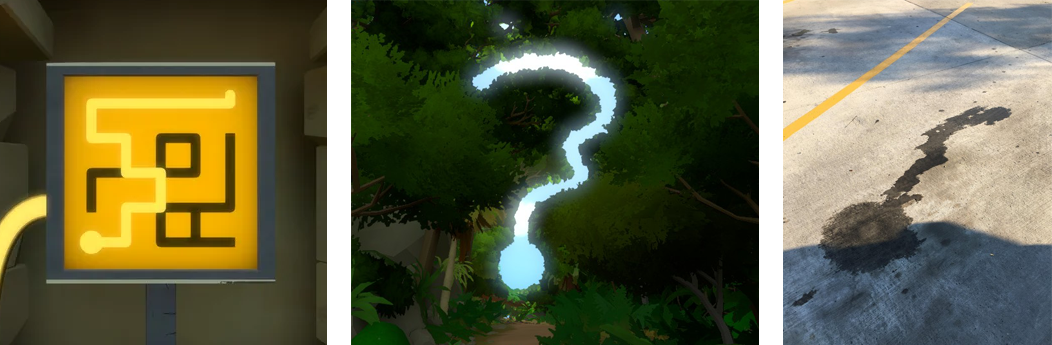 In the game The Witness, players solve puzzles by tracing patterns that begin with circles, and continue in continuous line to and endpoint point. At first these patterns appear only on panels, but players eventually realize that the entire island is filled with these patterns, and the real goal is to recognize these patterns in the surrounding environment. And after finishing, many players, myself included, began seeing these patterns in the real world as well.